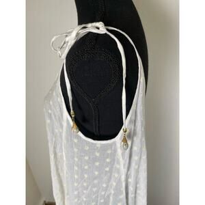 This is the perfect sheer dress for a hot afternoon. Made of 100% cotton, this airy dress with a ruched detailed scoop neck and back has dainty floral embroidery and adjustable tie straps with puka shells at the ends. Wear it over your suit for an outdoor lunch.