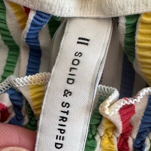 Women's Solid & Striped Bikini Size XS. Multicolored Stripe Audrey Bandeau Top with Matching Bottoms. Both pieces have Ruffle Details. Made of Polyamide, Polyester & Elastane. Hard to find set. Gently Used. Please see pictures for details.