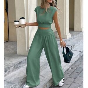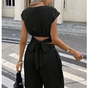 Solid Tie Back Scoop Neck Crop Top Wide Leg Pants Set