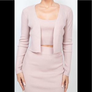 Top: A set of knit tank tops in a solid color, sleeveless, scoop neckline, and a cropped hem with a matching sweater featuring long sleeves, and an open front.