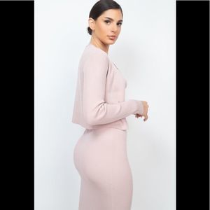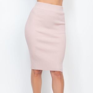 Bottom: A knit midi skirt featuring an elastic material, high waist, and a skinny fit.