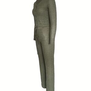 Casual Solid Set. The top is button front, v-neck, and drawstring wide-leg pants outfit. Ribbed texture.