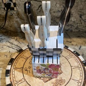 Solid Wood Knife Block, I hand painted in Black and white checks, decoupaged with Mackenzie Childs Flower Market Napkin and finished with a heavy, durable clear coating. It holds 6 Steak Knives and 6 others. KNIVES are NOT included. This is NOT Mackenzie Childs.