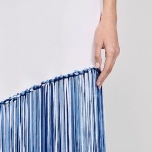 Sleeveless, round-necked, asymmetric knit maxi dress with contrasting fringing on the bottom.