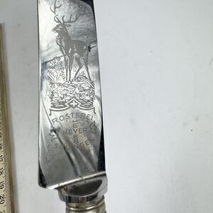 The Solingen Fixed Blade Knife Fork Set by Meyer Rostfrei is a vintage piece with a stainless steel blade and a handle made of stag/antler. It is an original item with a single blade, showcasing a classic silver color. Ideal for collectors of vintage folding knives and blades.