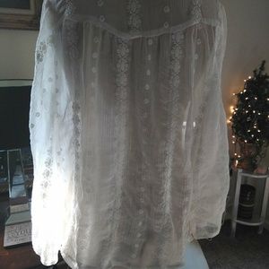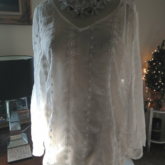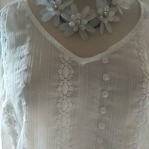 Beige lace pattern cape sleeve top. 100% polyester made in China. Hand washing cold water do not bleach dry and flat, iron and low temperature.