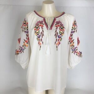 Solitaire Anthropologie Embroidered Peasant Floral Top White Pink Women’s Sz XL