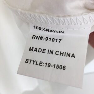 • White rayon fabric, with salmon pink, lavender, blue, green, and yellow, embroidered flowers.
