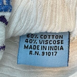 Solitaire for Anthropologie Tunic Top Swim Cover-Up in White Gauzy Knit with Blue Embroidered Detail. It has Bell Long Sleeves with Embroidered Flare Cuffs and Pom Pom Accents, a Elastic Round Neck that can be worn Off The Shoulders, a Curved Hem and a Pull-Over Style.