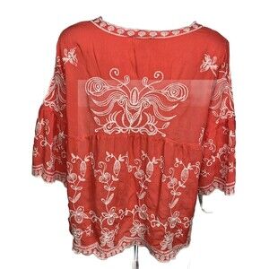 Solitaire Babydoll Boho Blouse Embroidery 3/4 Sleeve Peasant Top Coral Red Large