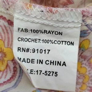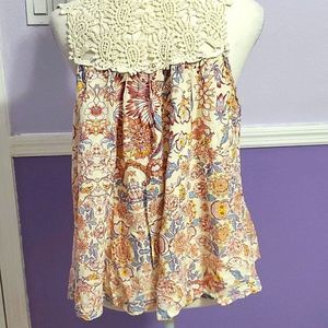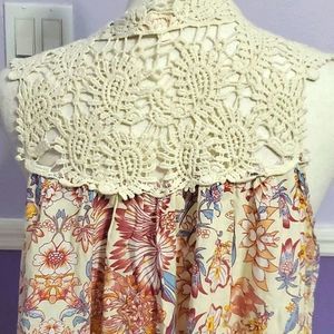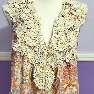 Cream floral flowy sleeveless top with crochet detail on front and back. Low V-neck on front. Shell is 100% rayon and crochet is 100% cotton.