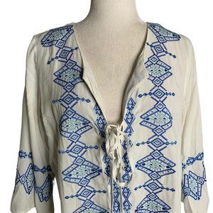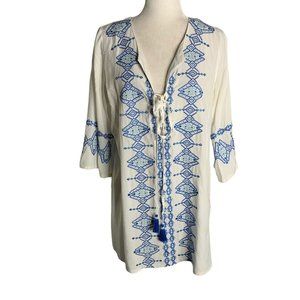 Solitaire Boho Cover Up Embroidered Tunic M White V Neck Lace Up Tassels