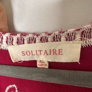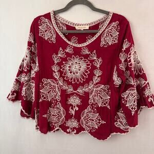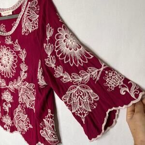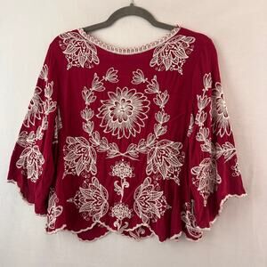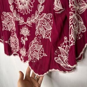 Solitaire Embroidered Blouse Boho Wine White Embroidered Scallop Hem XL