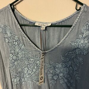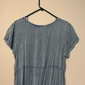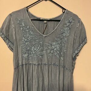 Blue dress with embroidered top. Embroidery around the sleeves and around the bottom. About 22 inches across and 37 inches long. With pockets. Very soft and comfy.