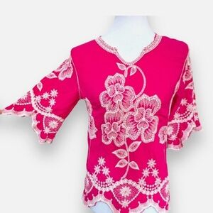 Solitaire Embroidered Pink and White Bell Sleeve Blouse