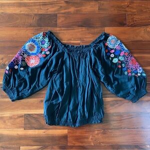 BNWT Solitaire ruffle blouse with floral embroidery on sleeves.