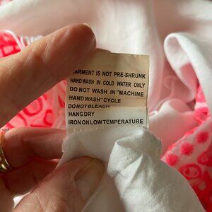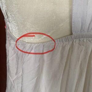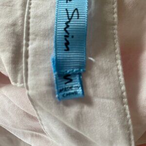 Women's Solitaire Swim pink and white swimsuit cover-up, size small. This cover-up is a racerback style, white with pink eyelets, and has a fringed hem. Smoke free pet free home! Quick shipper! Please see last picture circled in red - a small area that is folded inwards.
