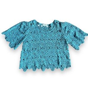 Elegant teal crochet top with intricate floral patterns. Ideal for a sophisticated style. Preowned. Excellent condition.