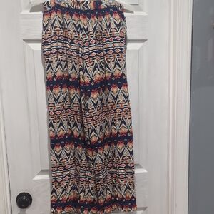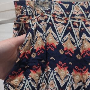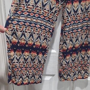 Size Large, good used condition, has pockets on the front. Colorful pants with intricate patterns. Features navy, and cream hues. Ideal for casual wear.