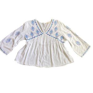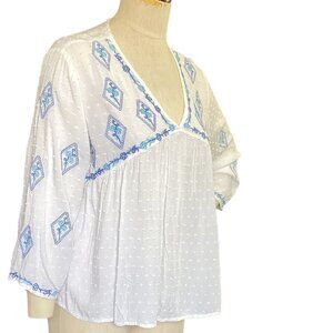 Description: BOHO Peasant Lightweight Embroidered Flower Pattern on Textured Swiss Dot V-Neck Babydoll Cropped Top with 3/4 Sleeves.