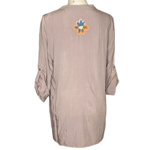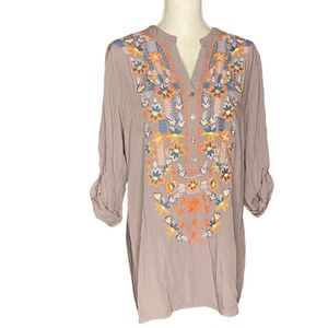 Solitaire Wm’s Sz Lrg Taupe Multi Colored Embroidered Boho Hippie Tunic Blouse