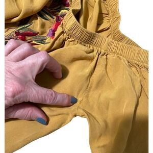 Lovely Bohemian/Peasant style blouse in gold/ mustard yellow with bright floral embroidered flowers on front!