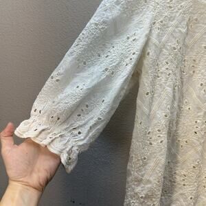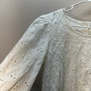 Solitaire Anthropologie Womens Cream Floral Embroidere Boho Peasant Eyelet 3/4 Sleeve Top Large puffed sleeves Cottagecore church modest see through / sheer cutouts crochet style button back