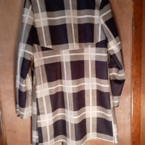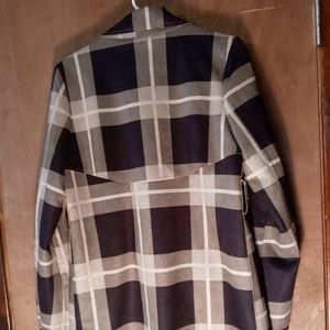 Beautiful open front (no closure) Solitaire jacket. Smooth, silky feel. Black/tan/brown large plaid design with smooth tan interior and two front pockets. This jacket is sure to be your new favorite!