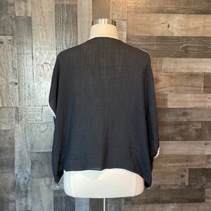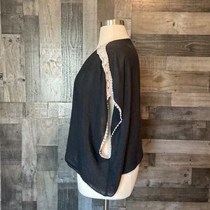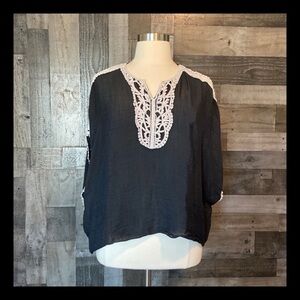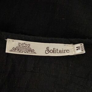This Solitaire top is black with cream crochet details. It is a perfect top for the warmer months. The materials tag was cut out during previous use. It is gently worn and is in excellent condition!