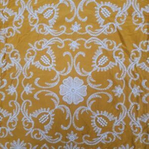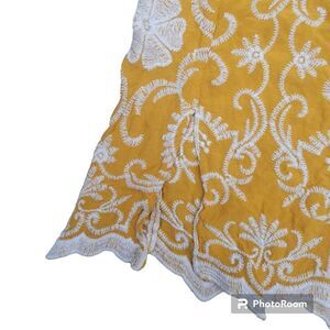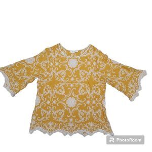 Beautiful top with heavy embroidery, 3/4 sleeves and a scallop hem. Is marked as a large but it's a small large and definitely would fit better as a M. In good pre-owned condition.