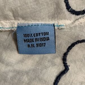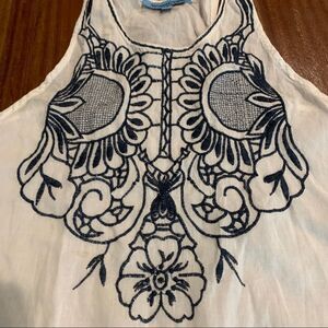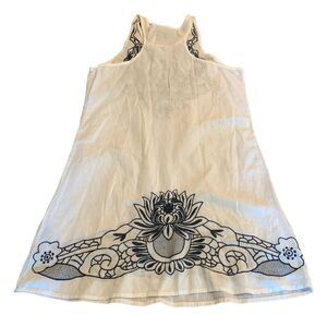 Solitaire Swim White Cotton Embroidered Racerback Coverup Small. Navy blue embroidered flowers and designs. Approximate measurements armpit to armpit 16 inches length 31 1/2 inches. Great preowned condition