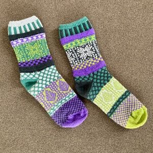 Balsam Crew Socks in shades of purple, black, lime green, pine green and gray.
