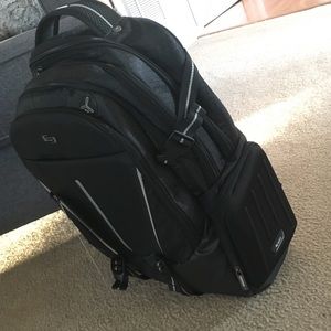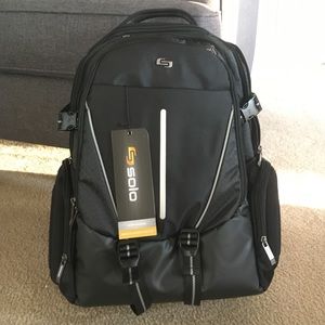 Solo 17.3 Laptop backpack provides the carrier with many functional features that include a padded compartment that protects laptops up to 17.3” and MacBooks up to 17”, dedicated interior pocket for iPad or tablet, front zip-down organizer section, hard shell side zippered pockets, reflective strip for increased visibility and a 5 year warranty.