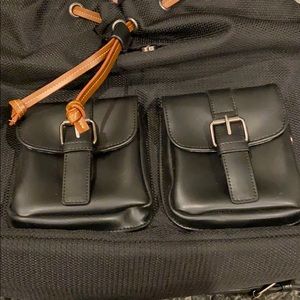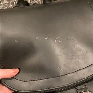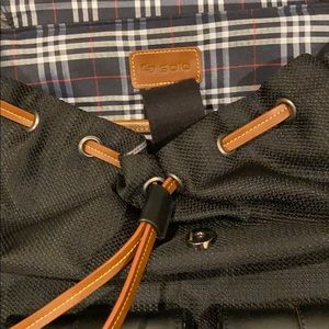 Sleek black backpack perfect for commuting to work or traveling. Drawstring tie with button closure, 2 front pockets, interior laptop sleeve and hidden zip compartment on top flap. Minor scratches on top flap (see pictures).