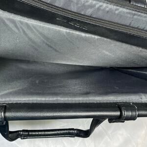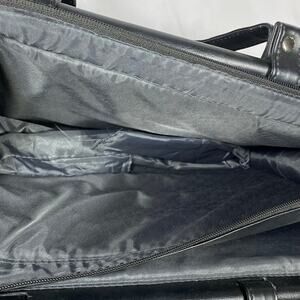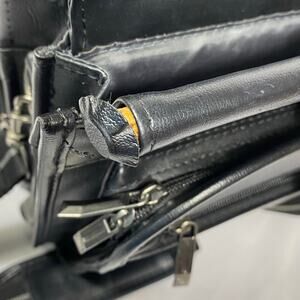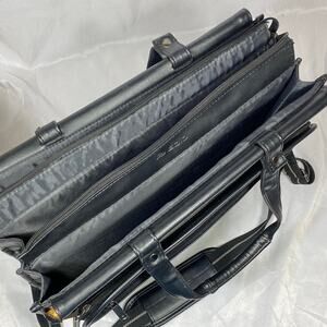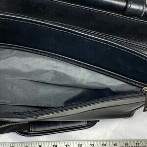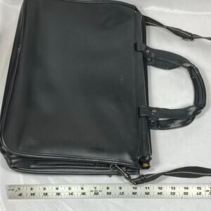 Introducing a Solo New York Black Leather Laptop Bag Briefcase, designed to fit laptops up to 15.5" such as a MacBook. This stylish briefcase comes with a comfortable strap. Item is used and in good condition.