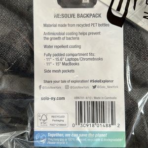 Website Product Description: “Solo Solve Recycled Backpack Collection. GREAT STYLE WHILE SAVING THE PLANET. We are tackling environmental issues from all angles, in-style. Designed in urban-cool gray, our Recycled Collection brings a sustainable angle to sleek design, making green choices accessible to the masses. Each item in this collection is built with city-functionality in mind and offers an uncompromising style. The Solve Recycled Backpacks fully padded compartment fits 11”-15.6” Laptops/Ultrabooks and 11”-15” MacBooks.”
