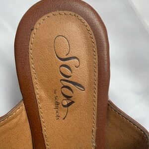 Solos by Softspots brown leather thong with multiple different brown and rust colored leather along with silver studs and ring embellishments. Wood grain look to the blocky 1 3/4” kitten heel.