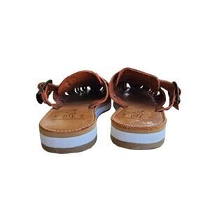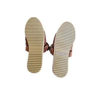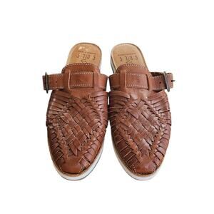 Sols Leather Huarache Mules in Brown. Size 8. Features almond toe, woven leather upper, buckle detail, and slip-on style. Excellent pre-owned condition.