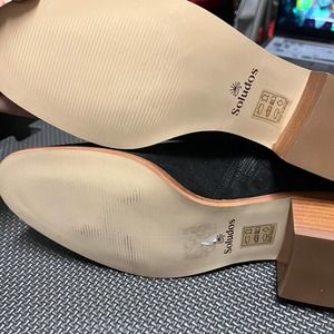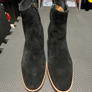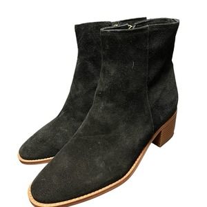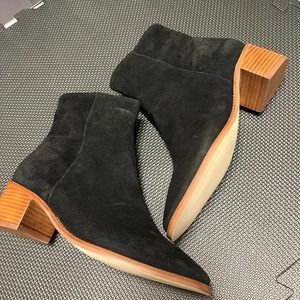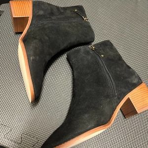 Chic black ankle boots by Soludos. Suede finish with a sturdy block heel. Perfect for versatile styling.