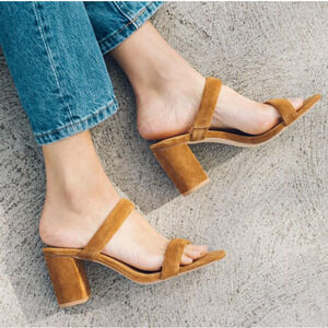 Minimalist suede brown with two comfy puffy bombayed straps (that’s just a fancy way of saying they’re extra cushioned to get that plush, on-trend look), and a sturdy chunky comfortable block heel, great business casual, weekend, everyday heel, get some height and still be comfortable
