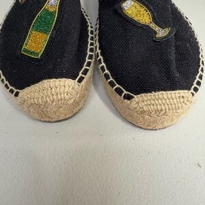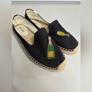 Raise a toast to style with these playful Soludos Cheers Espadrilles. Crafted in classic black cotton with a natural jute sole, they feature sparkling beaded embroidery of a champagne bottle and glass on the toe—perfect for celebrating in comfort and style. Inspired by the timeless Venetian smoking slipper, these espadrilles are as chic as they are sustainable.