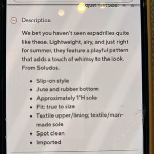 Cute summer shoe. It's in great condition! Only worn around the house. I have 3 other pair of Soludos and don't need another pair.