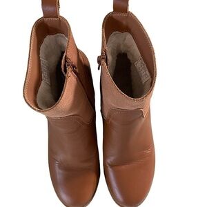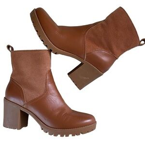 Soludos Dani Saddle Shearling Platform Heeled Ankle Boot leather suede tan 7.5