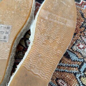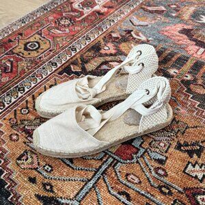 Worn once, ankle wrap espradilles. Beautiful shoe I just never wear them. Thick ribbon wraps around the ankle on this flat sandal. Muslin/natural color with rope detail. Size 7.5.