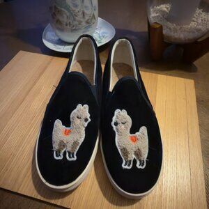 Add some fun and personality to your look with these Soludos slip-on sneakers, featuring adorable embroidered llamas on plush black velvet uppers. Equal parts playful and stylish, they’re perfect for casual days when you still want to stand out.