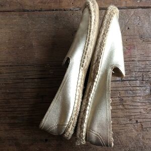 Comfort and a hint of fanciness with these metallic gold espadrilles from Soludos. Gently used condition. Size 6.