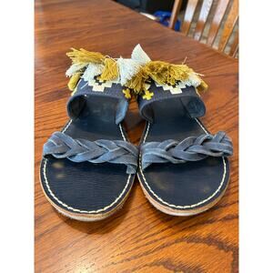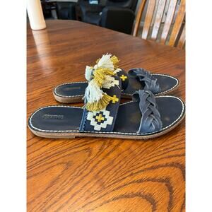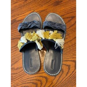 Soludos Navy and Yellow Tasseled Slide Sandals Size 9.5 Boho Chic Flat Slip On