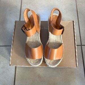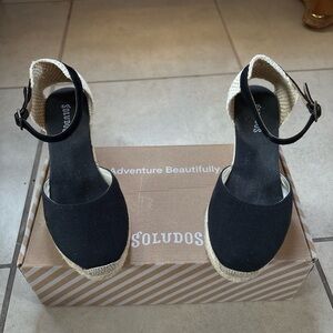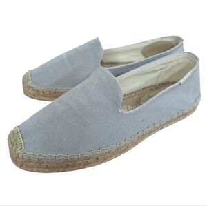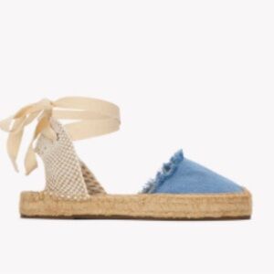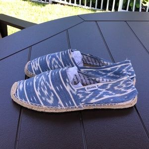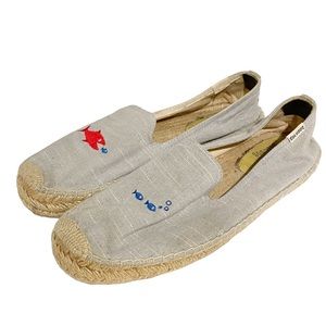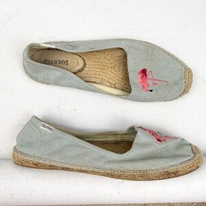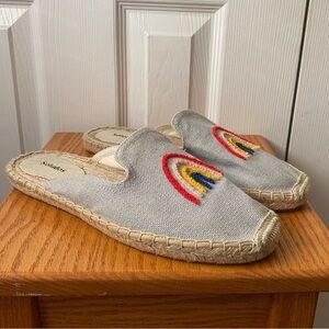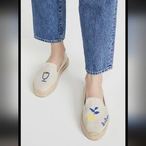New in Box Soludos Splatter Paint Platform Espadrilles. Casual denim Soludos espadrilles detailed with a colorful embroidered spots, styled to look like paint splatters. Braided raffia sidewall and rubber sole.