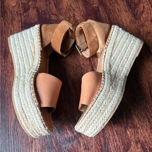 Elegant tan leather wedges with ankle strap. Comfortable and stylish for any outing. 503