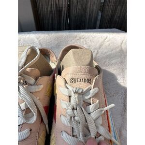 Keywords: Soludos, women's sneakers, pink leather, embroidered detail, rainbow wave, lace-up, athletic shoes, casual wear, size 10, pre-owned.
